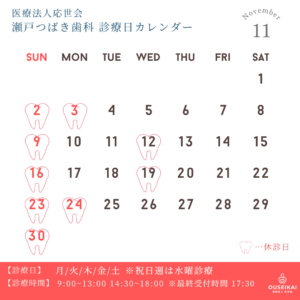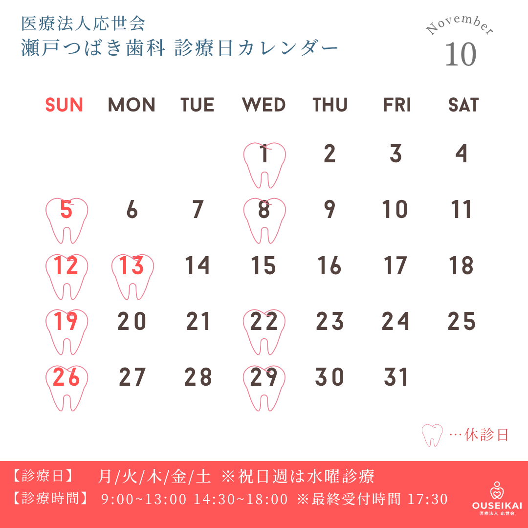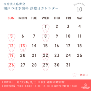 瀬戸つばき歯科 10月・11月の診療日カレンダー