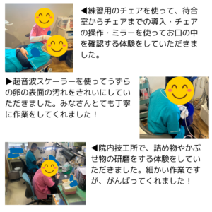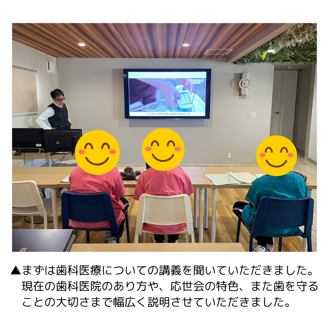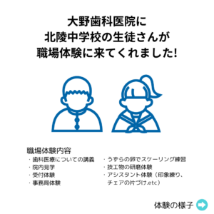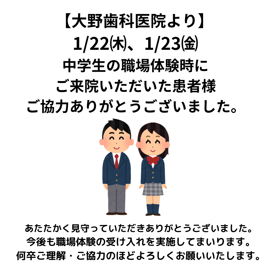 医療法人応世会 大野歯科医院です。 1/22㈭、23㈮の2日間、北陵中学校の生徒さんが職場体験に来てくれました。 受付体験や治療見学でご対応いただいた患者様方、あたたかく見守っていただきありがとうございました!