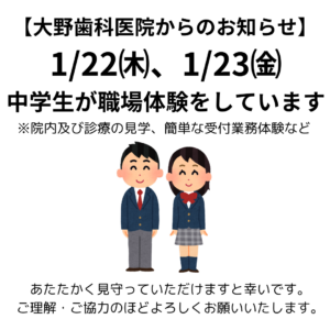 医療法人応世会 大野歯科医院です。 1/22㈭・23㈮は近隣の中学生が職業体験に来ています。 【内容】 院内及び診療の見学、簡単な受付業務体験など
